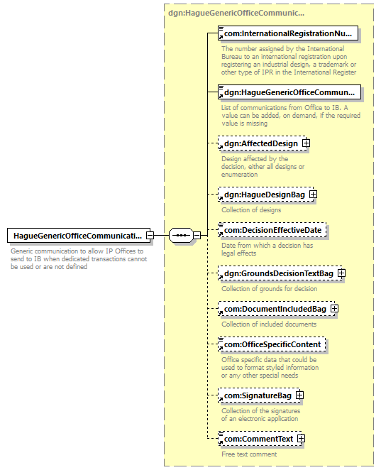 | children | com:InternationalRegistrationNumber dgn:HagueGenericOfficeCommunicationCategory dgn:AffectedDesign dgn:HagueDesignBag com:DecisionEffectiveDate dgn:GroundsDecisionTextBag com:DocumentIncludedBag com:OfficeSpecificContent com:SignatureBag com:CommentText | ||||