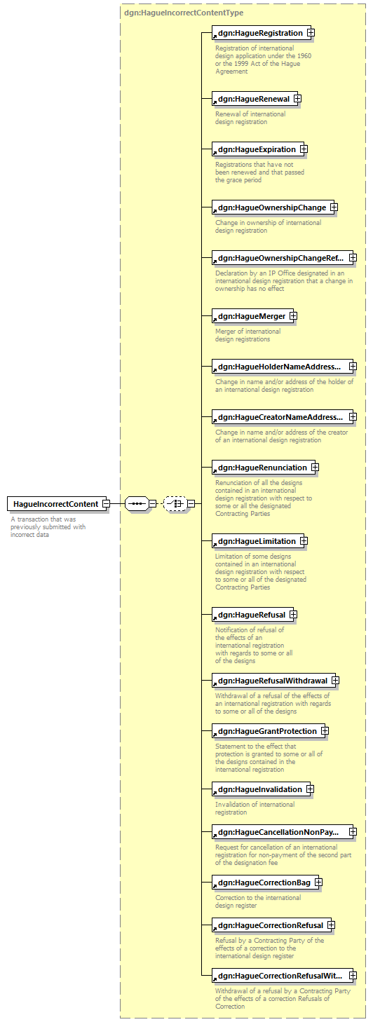 | children | dgn:HagueRegistration dgn:HagueRenewal dgn:HagueExpiration dgn:HagueOwnershipChange dgn:HagueOwnershipChangeRefusal dgn:HagueMerger dgn:HagueHolderNameAddressChange dgn:HagueCreatorNameAddressChange dgn:HagueRenunciation dgn:HagueLimitation dgn:HagueRefusal dgn:HagueRefusalWithdrawal dgn:HagueGrantProtection dgn:HagueInvalidation dgn:HagueCancellationNonPayment dgn:HagueCorrectionBag dgn:HagueCorrectionRefusal dgn:HagueCorrectionRefusalWithdrawal | ||||