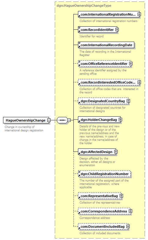 | children | com:InternationalRegistrationNumberBag com:RecordIdentifier com:InternationalRecordingDate com:OfficeReferenceIdentifier com:RecordInterestedOfficeCodeBag dgn:DesignatedCountryBag dgn:HolderChangeBag dgn:AffectedDesign dgn:ChildRegistrationNumber com:RepresentativeBag com:CorrespondenceAddress com:DocumentIncludedBag | ||||