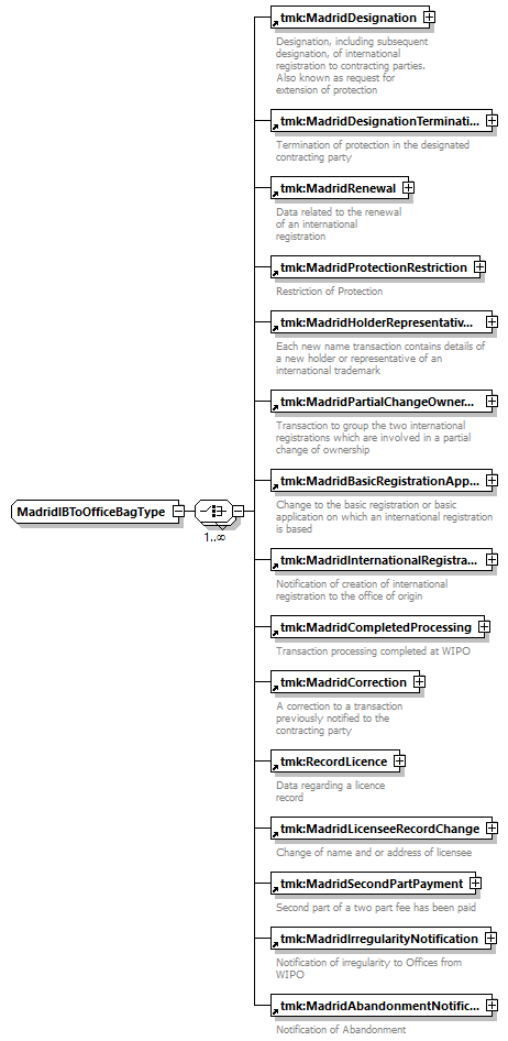 | children | tmk:MadridDesignation tmk:MadridDesignationTermination tmk:MadridRenewal tmk:MadridProtectionRestriction tmk:MadridHolderRepresentativeChange tmk:MadridPartialChangeOwnership tmk:MadridBasicRegistrationApplicationChange tmk:MadridInternationalRegistrationCreation tmk:MadridCompletedProcessing tmk:MadridCorrection tmk:RecordLicence tmk:MadridLicenseeRecordChange tmk:MadridSecondPartPayment tmk:MadridIrregularityNotification tmk:MadridAbandonmentNotification | ||||