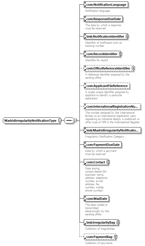 | children | com:NotificationLanguage com:ResponseDueDate tmk:NotificationIdentifier com:RecordIdentifier com:OfficeReferenceIdentifier com:ApplicantFileReference com:InternationalRegistrationNumber tmk:MadridIrregularityNotificationCategory com:PaymentDueDate com:Contact com:MailDate tmk:IrregularityBag com:PaymentBag | ||||
