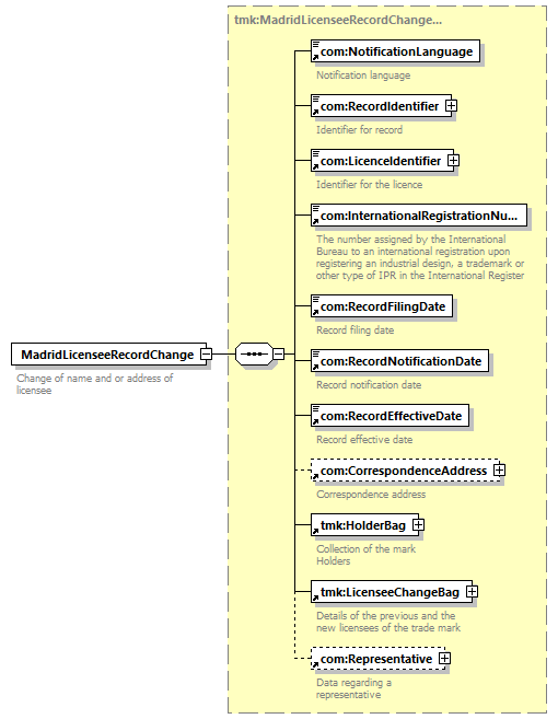 | children | com:NotificationLanguage com:RecordIdentifier com:LicenceIdentifier com:InternationalRegistrationNumber com:RecordFilingDate com:RecordNotificationDate com:RecordEffectiveDate com:CorrespondenceAddress tmk:HolderBag tmk:LicenseeChangeBag com:Representative | ||||