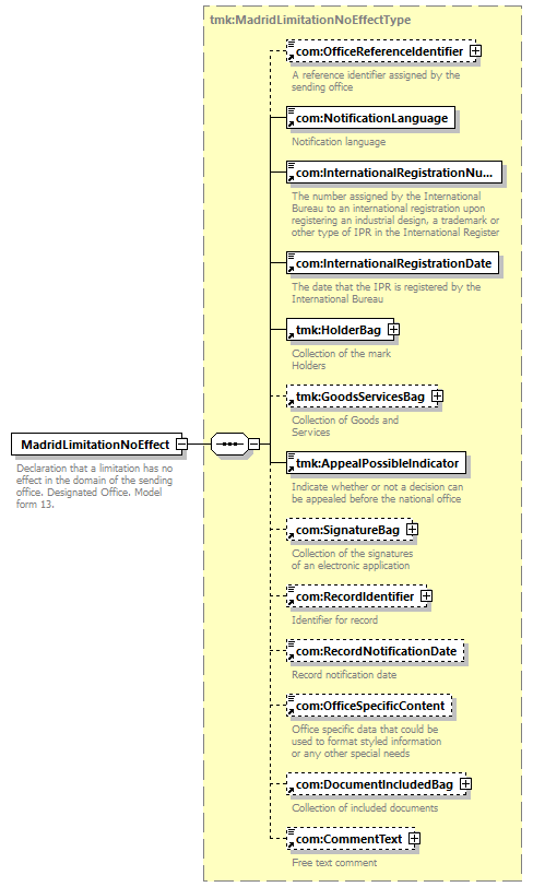 | children | com:OfficeReferenceIdentifier com:NotificationLanguage com:InternationalRegistrationNumber com:InternationalRegistrationDate tmk:HolderBag tmk:GoodsServicesBag tmk:AppealPossibleIndicator com:SignatureBag com:RecordIdentifier com:RecordNotificationDate com:OfficeSpecificContent com:DocumentIncludedBag com:CommentText | ||||