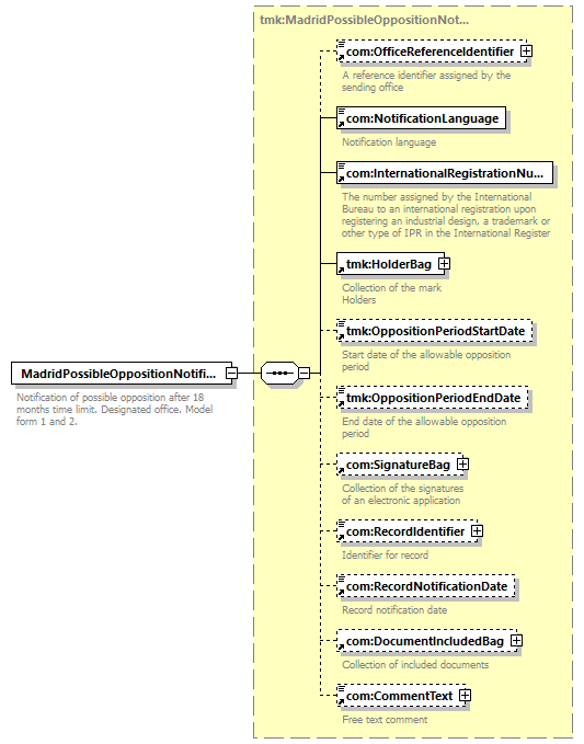 | children | com:OfficeReferenceIdentifier com:NotificationLanguage com:InternationalRegistrationNumber tmk:HolderBag tmk:OppositionPeriodStartDate tmk:OppositionPeriodEndDate com:SignatureBag com:RecordIdentifier com:RecordNotificationDate com:DocumentIncludedBag com:CommentText | ||||