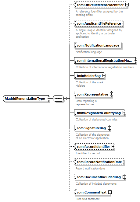 | children | com:OfficeReferenceIdentifier com:ApplicantFileReference com:NotificationLanguage com:InternationalRegistrationNumberBag tmk:HolderBag com:Representative tmk:DesignatedCountryBag com:SignatureBag com:RecordIdentifier com:RecordNotificationDate com:DocumentIncludedBag com:CommentText | ||||