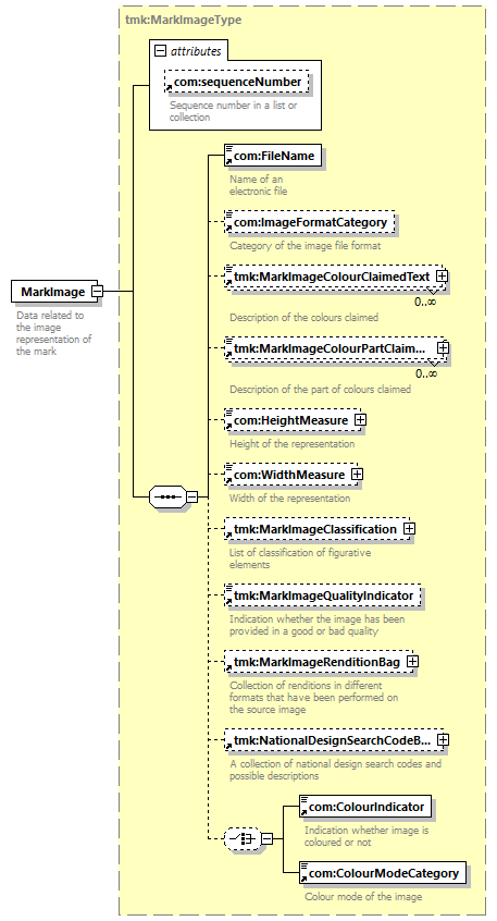 | children | com:FileName com:ImageFormatCategory tmk:MarkImageColourClaimedText tmk:MarkImageColourPartClaimedText com:HeightMeasure com:WidthMeasure tmk:MarkImageClassification tmk:MarkImageQualityIndicator tmk:MarkImageRenditionBag tmk:NationalDesignSearchCodeBag com:ColourIndicator com:ColourModeCategory | ||||||||||||||||||||||