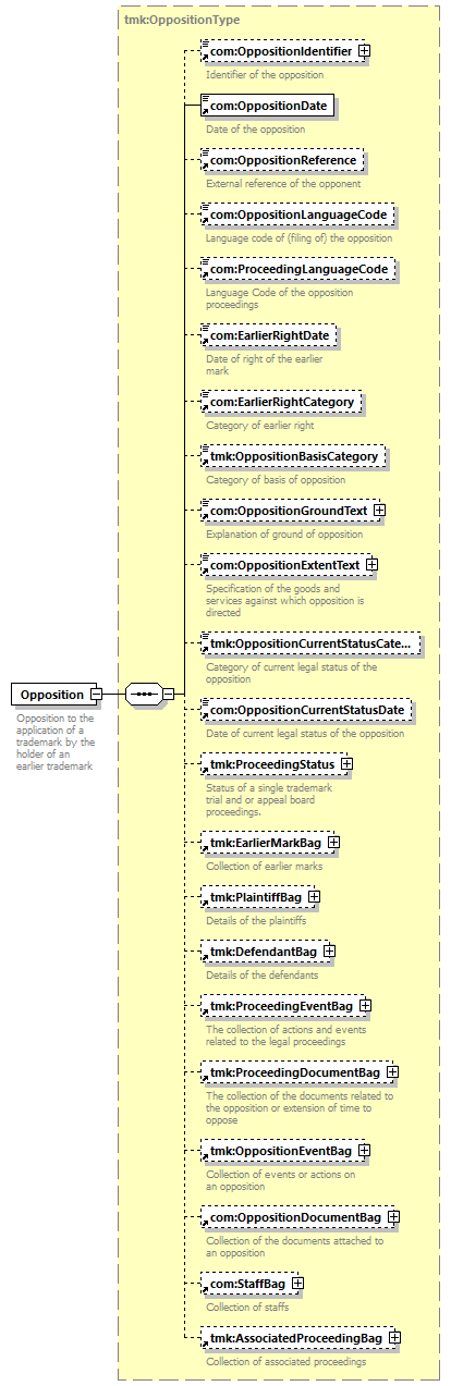 | children | com:OppositionIdentifier com:OppositionDate com:OppositionReference com:OppositionLanguageCode com:ProceedingLanguageCode com:EarlierRightDate com:EarlierRightCategory tmk:OppositionBasisCategory com:OppositionGroundText com:OppositionExtentText tmk:OppositionCurrentStatusCategory com:OppositionCurrentStatusDate tmk:ProceedingStatus tmk:EarlierMarkBag tmk:PlaintiffBag tmk:DefendantBag tmk:ProceedingEventBag tmk:ProceedingDocumentBag tmk:OppositionEventBag com:OppositionDocumentBag com:StaffBag tmk:AssociatedProceedingBag | ||||