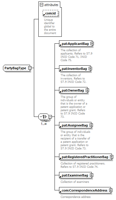 | children | pat:ApplicantBag pat:InventorBag pat:OwnerBag pat:AssigneeBag pat:RegisteredPractitionerBag pat:ExaminerBag com:CorrespondenceAddress |