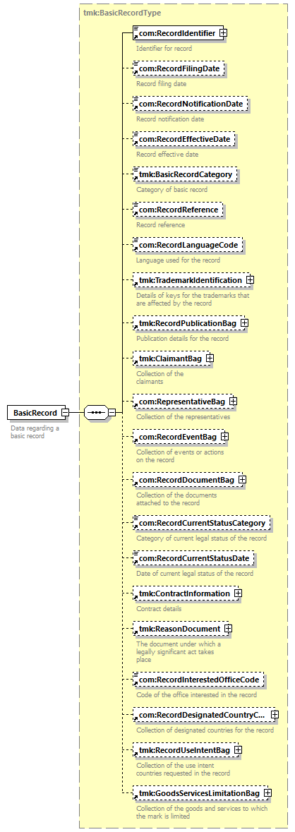 | children | com:RecordIdentifier com:RecordFilingDate com:RecordNotificationDate com:RecordEffectiveDate tmk:BasicRecordCategory com:RecordReference com:RecordLanguageCode tmk:TrademarkIdentification tmk:RecordPublicationBag tmk:ClaimantBag com:RepresentativeBag com:RecordEventBag com:RecordDocumentBag com:RecordCurrentStatusCategory com:RecordCurrentStatusDate tmk:ContractInformation tmk:ReasonDocument com:RecordInterestedOfficeCode com:RecordDesignatedCountryCodeBag tmk:RecordUseIntentBag tmk:GoodsServicesLimitationBag | ||||