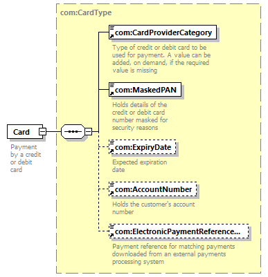 | children | com:CardProviderCategory com:MaskedPAN com:ExpiryDate com:AccountNumber com:ElectronicPaymentReferenceText | ||||