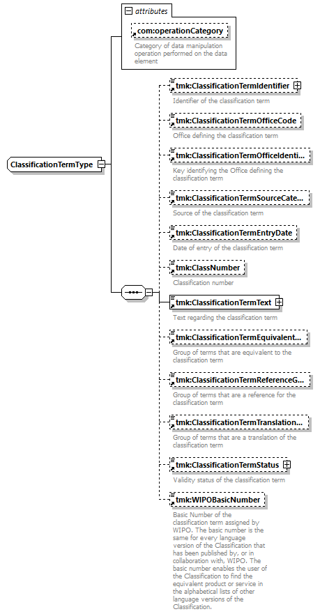 | children | tmk:ClassificationTermIdentifier tmk:ClassificationTermOfficeCode tmk:ClassificationTermOfficeIdentification tmk:ClassificationTermSourceCategory tmk:ClassificationTermEntryDate tmk:ClassNumber tmk:ClassificationTermText tmk:ClassificationTermEquivalentGroup tmk:ClassificationTermReferenceGroup tmk:ClassificationTermTranslationGroup tmk:ClassificationTermStatus tmk:WIPOBasicNumber |