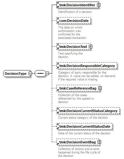 | children | tmk:DecisionIdentifier com:DecisionDate tmk:DecisionText tmk:DecisionResponsibleCategory tmk:CaseReferenceBag tmk:DecisionCurrentStatusCategory tmk:DecisionCurrentStatusDate tmk:DecisionEventBag | ||||