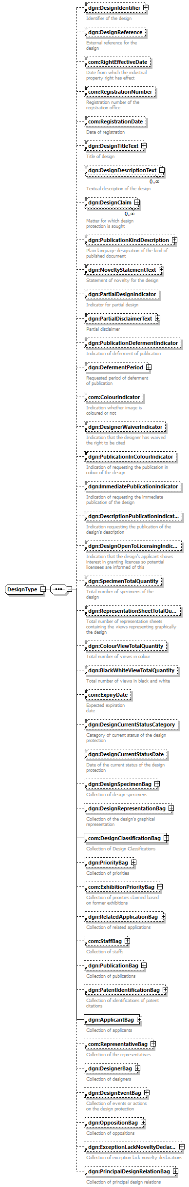| children | dgn:DesignIdentifier dgn:DesignReference com:RightEffectiveDate com:RegistrationNumber com:RegistrationDate dgn:DesignTitleText dgn:DesignDescriptionText dgn:DesignClaim dgn:PublicationKindDescription dgn:NoveltyStatementText dgn:PartialDesignIndicator dgn:PartialDisclaimerText dgn:PublicationDefermentIndicator dgn:DefermentPeriod com:ColourIndicator dgn:DesignerWaiverIndicator dgn:PublicationInColourIndicator dgn:ImmediatePublicationIndicator dgn:DescriptionPublicationIndicator dgn:DesignOpenToLicensingIndicator dgn:SpecimenTotalQuantity dgn:RepresentationSheetTotalQuantity dgn:ColourViewTotalQuantity dgn:BlackWhiteViewTotalQuantity com:ExpiryDate dgn:DesignCurrentStatusCategory dgn:DesignCurrentStatusDate dgn:DesignSpecimenBag dgn:DesignRepresentationBag com:DesignClassificationBag dgn:PriorityBag com:ExhibitionPriorityBag dgn:RelatedApplicationBag com:StaffBag dgn:PublicationBag dgn:PatentIdentificationBag dgn:ApplicantBag com:RepresentativeBag dgn:DesignerBag dgn:DesignEventBag dgn:OppositionBag dgn:ExceptionLackNoveltyDeclarationBag dgn:PrincipalDesignRelationBag | ||||