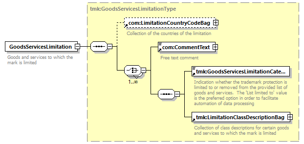 | children | com:LimitationCountryCodeBag com:CommentText tmk:GoodsServicesLimitationCategory tmk:LimitationClassDescriptionBag | ||||