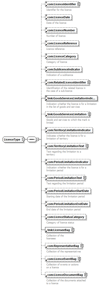 | children | com:LicenceIdentifier com:LicenceDate com:LicenceNumber com:LicenceReference com:LicenceCategory com:SublicenceIndicator com:RelatedLicenceIdentifier tmk:GoodsServicesLimitationIndicator tmk:GoodsServicesLimitation com:TerritoryLimitationIndicator com:TerritoryLimitationText com:PeriodLimitationIndicator com:PeriodLimitationText com:PeriodLimitationStartDate com:PeriodLimitationEndDate com:LicenceStatusCategory tmk:LicenseeBag com:RepresentativeBag com:LicenceEventBag com:LicenceDocumentBag | ||||