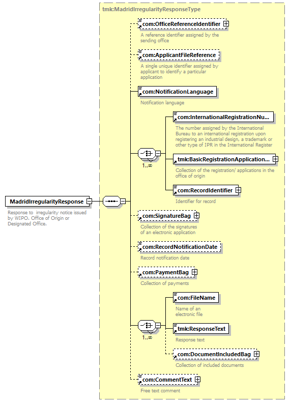 | children | com:OfficeReferenceIdentifier com:ApplicantFileReference com:NotificationLanguage com:InternationalRegistrationNumber tmk:BasicRegistrationApplicationBag com:RecordIdentifier com:SignatureBag com:RecordNotificationDate com:PaymentBag com:FileName tmk:ResponseText com:DocumentIncludedBag com:CommentText | ||||