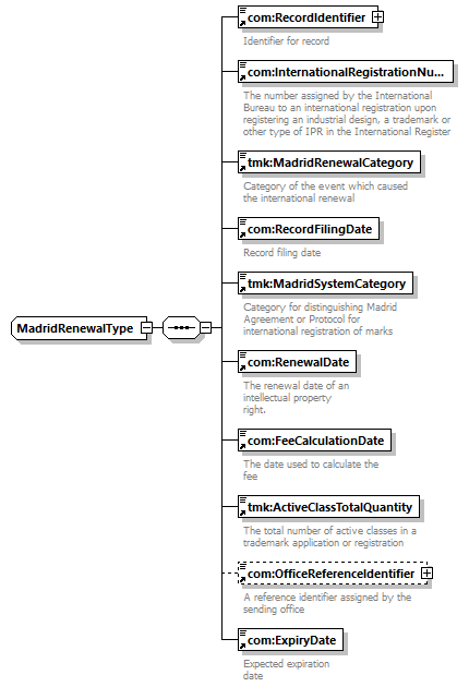 | children | com:RecordIdentifier com:InternationalRegistrationNumber tmk:MadridRenewalCategory com:RecordFilingDate tmk:MadridSystemCategory com:RenewalDate com:FeeCalculationDate tmk:ActiveClassTotalQuantity com:OfficeReferenceIdentifier com:ExpiryDate | ||||