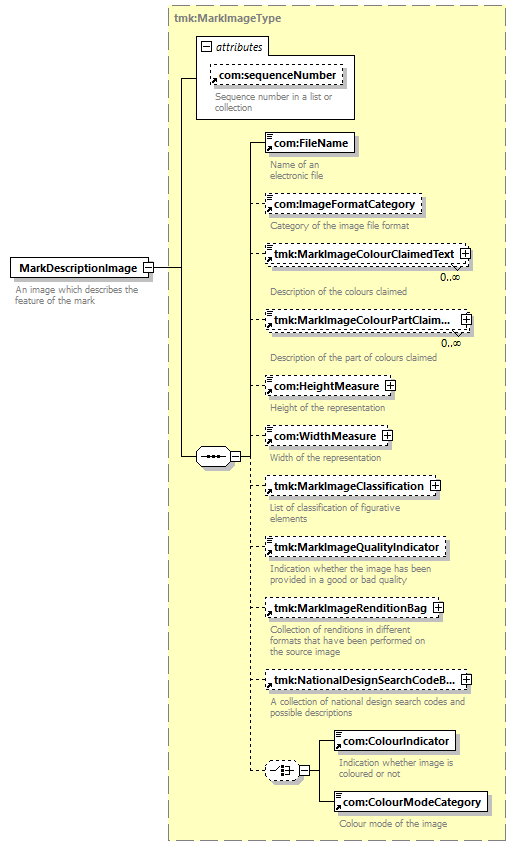 | children | com:FileName com:ImageFormatCategory tmk:MarkImageColourClaimedText tmk:MarkImageColourPartClaimedText com:HeightMeasure com:WidthMeasure tmk:MarkImageClassification tmk:MarkImageQualityIndicator tmk:MarkImageRenditionBag tmk:NationalDesignSearchCodeBag com:ColourIndicator com:ColourModeCategory | ||||||||||||||||||||||
