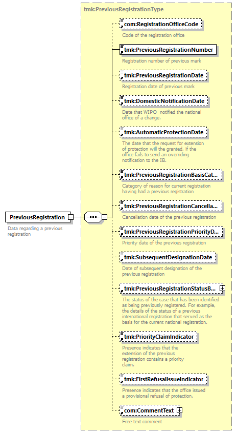 | children | com:RegistrationOfficeCode tmk:PreviousRegistrationNumber tmk:PreviousRegistrationDate tmk:DomesticNotificationDate tmk:AutomaticProtectionDate tmk:PreviousRegistrationBasisCategory tmk:PreviousRegistrationCancellationDate tmk:PreviousRegistrationPriorityDate tmk:SubsequentDesignationDate tmk:PreviousRegistrationStatusBag tmk:PriorityClaimIndicator tmk:FirstRefusalIssueIndicator com:CommentText | ||||