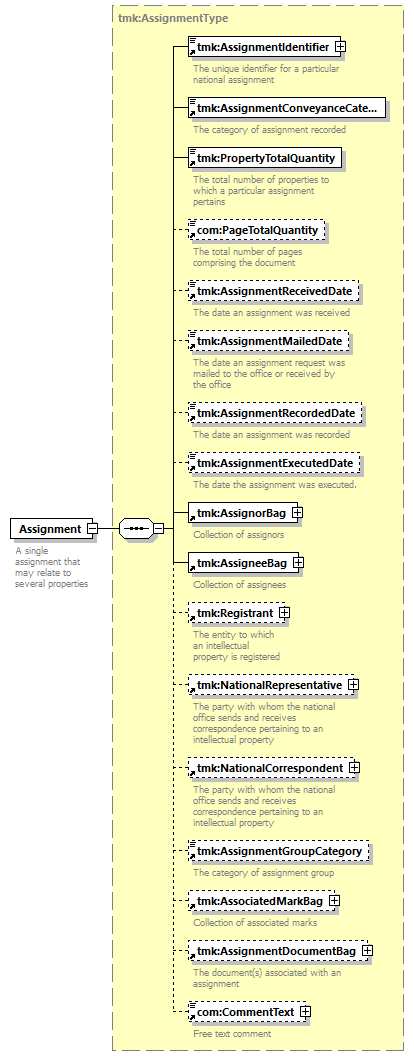 | children | tmk:AssignmentIdentifier tmk:AssignmentConveyanceCategory tmk:PropertyTotalQuantity com:PageTotalQuantity tmk:AssignmentReceivedDate tmk:AssignmentMailedDate tmk:AssignmentRecordedDate tmk:AssignmentExecutedDate tmk:AssignorBag tmk:AssigneeBag tmk:Registrant tmk:NationalRepresentative tmk:NationalCorrespondent tmk:AssignmentGroupCategory tmk:AssociatedMarkBag tmk:AssignmentDocumentBag com:CommentText | ||||