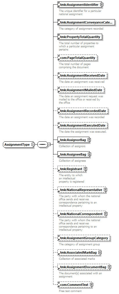 | children | tmk:AssignmentIdentifier tmk:AssignmentConveyanceCategory tmk:PropertyTotalQuantity com:PageTotalQuantity tmk:AssignmentReceivedDate tmk:AssignmentMailedDate tmk:AssignmentRecordedDate tmk:AssignmentExecutedDate tmk:AssignorBag tmk:AssigneeBag tmk:Registrant tmk:NationalRepresentative tmk:NationalCorrespondent tmk:AssignmentGroupCategory tmk:AssociatedMarkBag tmk:AssignmentDocumentBag com:CommentText | ||||
