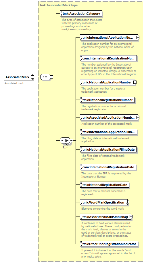 | children | tmk:AssociationCategory tmk:InternationalApplicationNumber com:InternationalRegistrationNumber tmk:NationalApplicationNumber tmk:NationalRegistrationNumber tmk:AssociatedApplicationNumber tmk:InternationalApplicationFilingDate tmk:NationalApplicationFilingDate com:InternationalRegistrationDate tmk:NationalRegistrationDate tmk:WordMarkSpecification tmk:AssociatedMarkStatusBag tmk:OtherPriorRegistrationIndicator | ||||