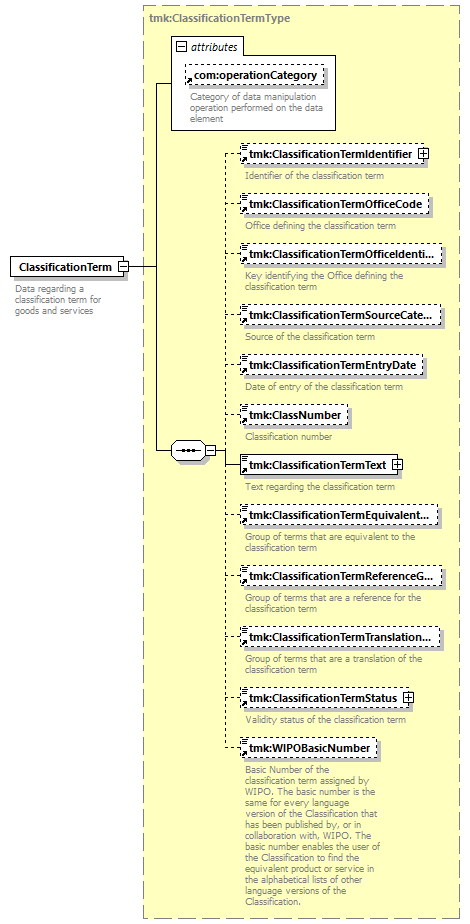 | children | tmk:ClassificationTermIdentifier tmk:ClassificationTermOfficeCode tmk:ClassificationTermOfficeIdentification tmk:ClassificationTermSourceCategory tmk:ClassificationTermEntryDate tmk:ClassNumber tmk:ClassificationTermText tmk:ClassificationTermEquivalentGroup tmk:ClassificationTermReferenceGroup tmk:ClassificationTermTranslationGroup tmk:ClassificationTermStatus tmk:WIPOBasicNumber | ||||||||||||||||||||||