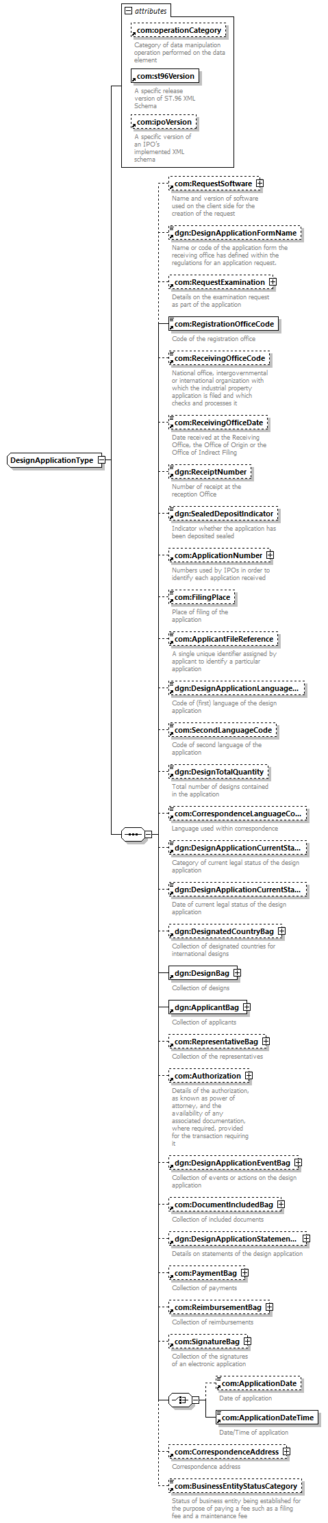 | children | com:RequestSoftware dgn:DesignApplicationFormName com:RequestExamination com:RegistrationOfficeCode com:ReceivingOfficeCode com:ReceivingOfficeDate dgn:ReceiptNumber dgn:SealedDepositIndicator com:ApplicationNumber com:FilingPlace com:ApplicantFileReference dgn:DesignApplicationLanguageCode com:SecondLanguageCode dgn:DesignTotalQuantity com:CorrespondenceLanguageCode dgn:DesignApplicationCurrentStatusCategory dgn:DesignApplicationCurrentStatusDate dgn:DesignatedCountryBag dgn:DesignBag dgn:ApplicantBag com:RepresentativeBag com:Authorization dgn:DesignApplicationEventBag com:DocumentIncludedBag dgn:DesignApplicationStatementBag com:PaymentBag com:ReimbursementBag com:SignatureBag com:ApplicationDate com:ApplicationDateTime com:CorrespondenceAddress com:BusinessEntityStatusCategory | ||||||||||||||||||||||||||||||||||||||||||||