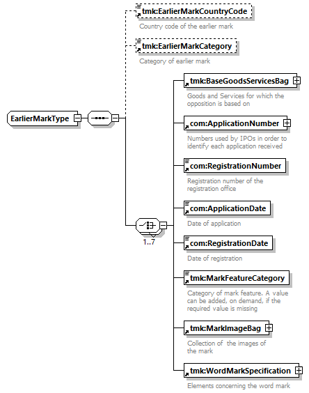 | children | tmk:EarlierMarkCountryCode tmk:EarlierMarkCategory tmk:BaseGoodsServicesBag com:ApplicationNumber com:RegistrationNumber com:ApplicationDate com:RegistrationDate tmk:MarkFeatureCategory tmk:MarkImageBag tmk:WordMarkSpecification | ||||