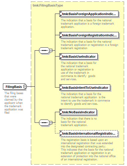 | children | tmk:BasisForeignApplicationIndicator tmk:BasisForeignRegistrationIndicator tmk:BasisUseIndicator tmk:BasisIntentToUseIndicator tmk:NoBasisIndicator tmk:BasisInternationalRegistrationIndicator | ||||