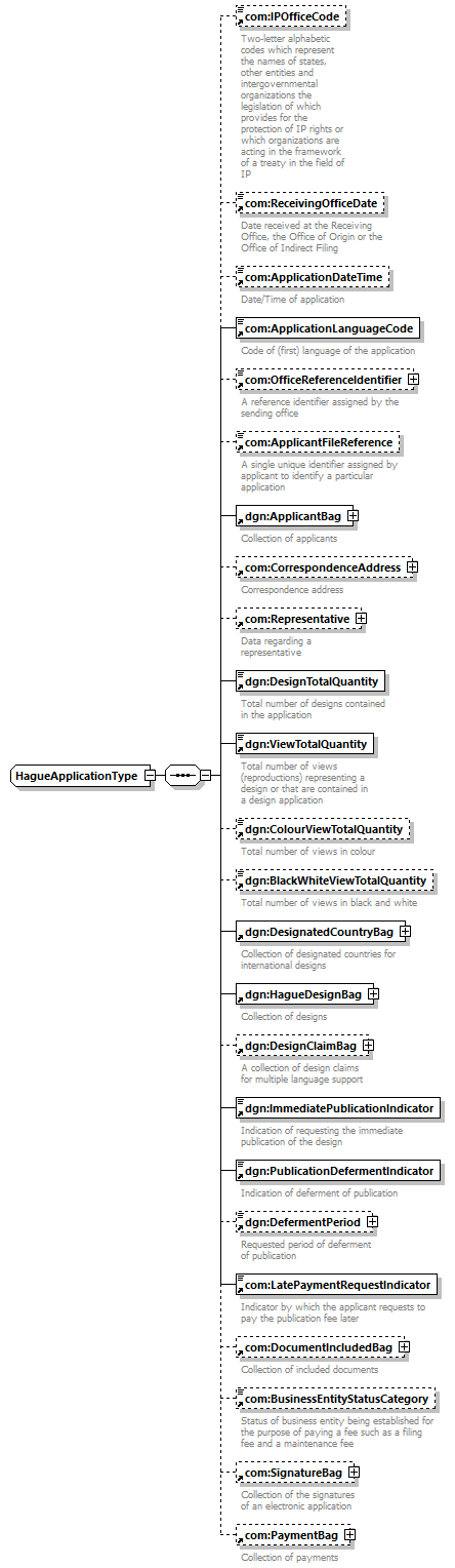 | children | com:IPOfficeCode com:ReceivingOfficeDate com:ApplicationDateTime com:ApplicationLanguageCode com:OfficeReferenceIdentifier com:ApplicantFileReference dgn:ApplicantBag com:CorrespondenceAddress com:Representative dgn:DesignTotalQuantity dgn:ViewTotalQuantity dgn:ColourViewTotalQuantity dgn:BlackWhiteViewTotalQuantity dgn:DesignatedCountryBag dgn:HagueDesignBag dgn:DesignClaimBag dgn:ImmediatePublicationIndicator dgn:PublicationDefermentIndicator dgn:DefermentPeriod com:LatePaymentRequestIndicator com:DocumentIncludedBag com:BusinessEntityStatusCategory com:SignatureBag com:PaymentBag | ||||
