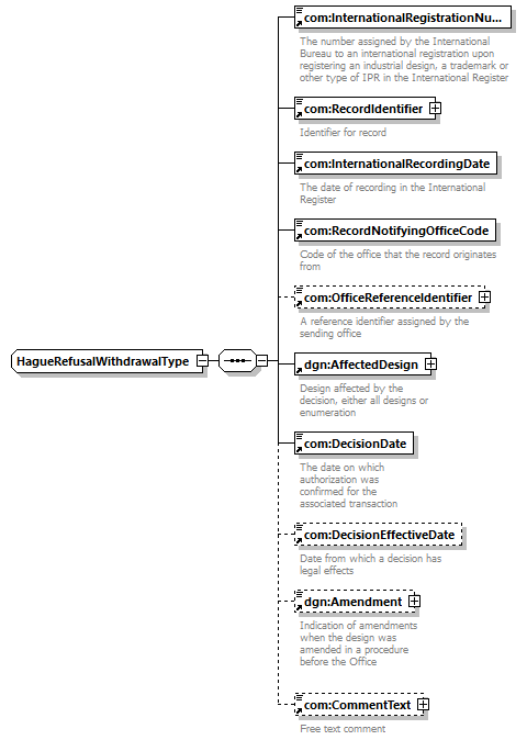 | children | com:InternationalRegistrationNumber com:RecordIdentifier com:InternationalRecordingDate com:RecordNotifyingOfficeCode com:OfficeReferenceIdentifier dgn:AffectedDesign com:DecisionDate com:DecisionEffectiveDate dgn:Amendment com:CommentText | ||||