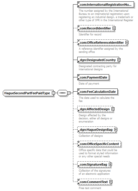 | children | com:InternationalRegistrationNumber com:RecordIdentifier com:OfficeReferenceIdentifier dgn:DesignatedCountry com:PaymentDate com:FeeCalculationDate dgn:AffectedDesign dgn:HagueDesignBag com:OfficeSpecificContent com:SignatureBag com:CommentText | ||||