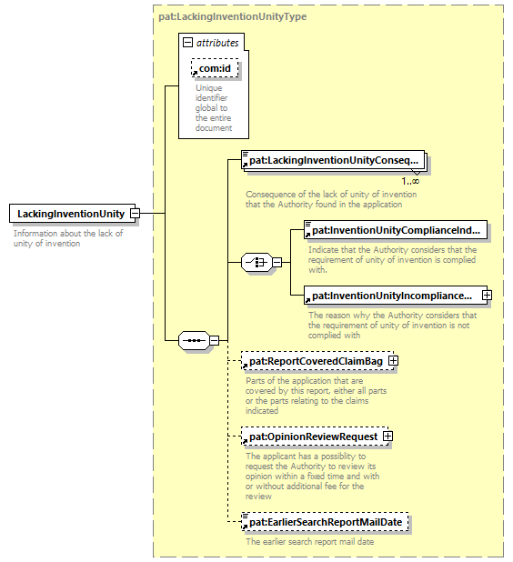 | children | pat:LackingInventionUnityConsequenceCategory pat:InventionUnityComplianceIndicator pat:InventionUnityIncomplianceReason pat:ReportCoveredClaimBag pat:OpinionReviewRequest pat:EarlierSearchReportMailDate | ||||||||||||||||||||||