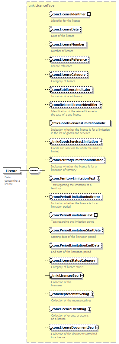 | children | com:LicenceIdentifier com:LicenceDate com:LicenceNumber com:LicenceReference com:LicenceCategory com:SublicenceIndicator com:RelatedLicenceIdentifier tmk:GoodsServicesLimitationIndicator tmk:GoodsServicesLimitation com:TerritoryLimitationIndicator com:TerritoryLimitationText com:PeriodLimitationIndicator com:PeriodLimitationText com:PeriodLimitationStartDate com:PeriodLimitationEndDate com:LicenceStatusCategory tmk:LicenseeBag com:RepresentativeBag com:LicenceEventBag com:LicenceDocumentBag | ||||