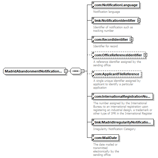 | children | com:NotificationLanguage tmk:NotificationIdentifier com:RecordIdentifier com:OfficeReferenceIdentifier com:ApplicantFileReference com:InternationalRegistrationNumber tmk:MadridIrregularityNotificationCategory com:MailDate | ||||