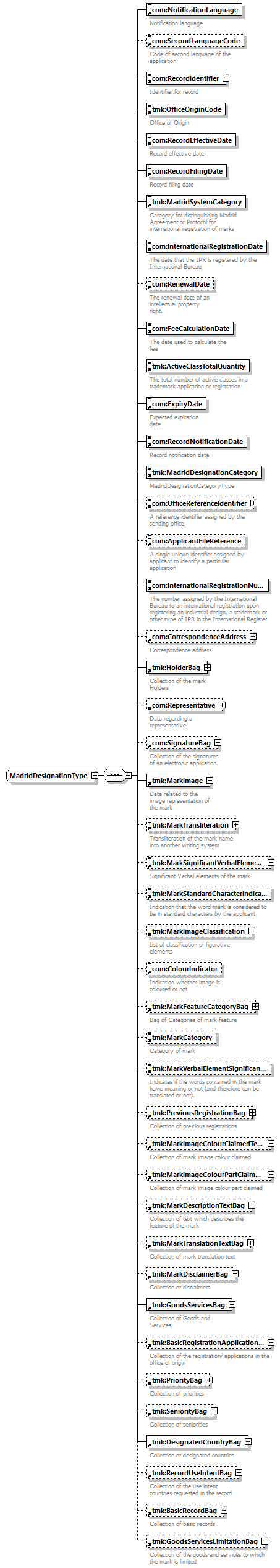 | children | com:NotificationLanguage com:SecondLanguageCode com:RecordIdentifier tmk:OfficeOriginCode com:RecordEffectiveDate com:RecordFilingDate tmk:MadridSystemCategory com:InternationalRegistrationDate com:RenewalDate com:FeeCalculationDate tmk:ActiveClassTotalQuantity com:ExpiryDate com:RecordNotificationDate tmk:MadridDesignationCategory com:OfficeReferenceIdentifier com:ApplicantFileReference com:InternationalRegistrationNumber com:CorrespondenceAddress tmk:HolderBag com:Representative com:SignatureBag tmk:MarkImage tmk:MarkTransliteration tmk:MarkSignificantVerbalElementText tmk:MarkStandardCharacterIndicator tmk:MarkImageClassification com:ColourIndicator tmk:MarkFeatureCategoryBag tmk:MarkCategory tmk:MarkVerbalElementSignificantIndicator tmk:PreviousRegistrationBag tmk:MarkImageColourClaimedTextBag tmk:MarkImageColourPartClaimedTextBag tmk:MarkDescriptionTextBag tmk:MarkTranslationTextBag tmk:MarkDisclaimerBag tmk:GoodsServicesBag tmk:BasicRegistrationApplicationBag tmk:PriorityBag tmk:SeniorityBag tmk:DesignatedCountryBag tmk:RecordUseIntentBag tmk:BasicRecordBag tmk:GoodsServicesLimitationBag | ||||