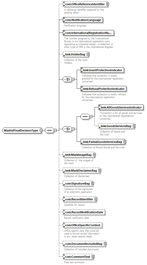 | children | com:OfficeReferenceIdentifier com:NotificationLanguage com:InternationalRegistrationNumber tmk:HolderBag tmk:GrantProtectionIndicator tmk:RefusalProtectionIndicator tmk:AllGoodsServicesIndicator tmk:GoodsServicesBag tmk:PartialGoodsServicesBag tmk:MarkImageBag tmk:MarkDisclaimerBag com:SignatureBag com:RecordIdentifier com:RecordNotificationDate com:OfficeSpecificContent com:DocumentIncludedBag com:CommentText | ||||