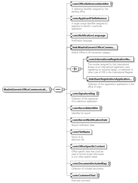| children | com:OfficeReferenceIdentifier com:ApplicantFileReference com:NotificationLanguage tmk:MadridGenericOfficeCommunicationCategory com:InternationalRegistrationNumber tmk:BasicRegistrationApplicationBag com:SignatureBag com:RecordIdentifier com:RecordNotificationDate com:FileName com:OfficeSpecificContent com:DocumentIncludedBag com:CommentText | ||||