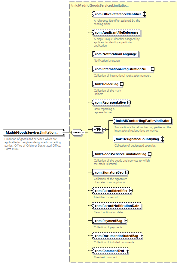 | children | com:OfficeReferenceIdentifier com:ApplicantFileReference com:NotificationLanguage com:InternationalRegistrationNumberBag tmk:HolderBag com:Representative tmk:AllContractingPartiesIndicator tmk:DesignatedCountryBag tmk:GoodsServicesLimitationBag com:SignatureBag com:RecordIdentifier com:RecordNotificationDate com:PaymentBag com:DocumentIncludedBag com:CommentText | ||||