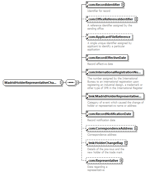 | children | com:RecordIdentifier com:OfficeReferenceIdentifier com:ApplicantFileReference com:RecordEffectiveDate com:InternationalRegistrationNumber tmk:MadridHolderRepresentativeChangeCategory com:RecordNotificationDate com:CorrespondenceAddress tmk:HolderChangeBag com:Representative | ||||