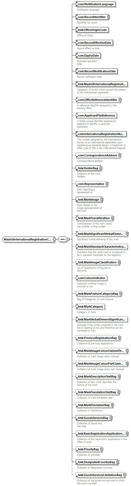 | children | com:NotificationLanguage com:RecordIdentifier tmk:OfficeOriginCode com:RecordEffectiveDate com:ExpiryDate com:RecordNotificationDate tmk:MadridInternationalRegistrationCreationCategory com:OfficeReferenceIdentifier com:ApplicantFileReference com:InternationalRegistrationNumber com:CorrespondenceAddress tmk:HolderBag com:Representative tmk:MarkImage tmk:MarkTransliteration tmk:MarkSignificantVerbalElementText tmk:MarkStandardCharacterIndicator tmk:MarkImageClassification com:ColourIndicator tmk:MarkFeatureCategoryBag tmk:MarkCategory tmk:MarkVerbalElementSignificantIndicator tmk:PreviousRegistrationBag tmk:MarkImageColourClaimedTextBag tmk:MarkImageColourPartClaimedTextBag tmk:MarkDescriptionTextBag tmk:MarkTranslationTextBag tmk:MarkDisclaimerBag tmk:GoodsServicesBag tmk:BasicRegistrationApplicationBag tmk:PriorityBag tmk:DesignatedCountryBag tmk:GoodsServicesLimitationBag | ||||