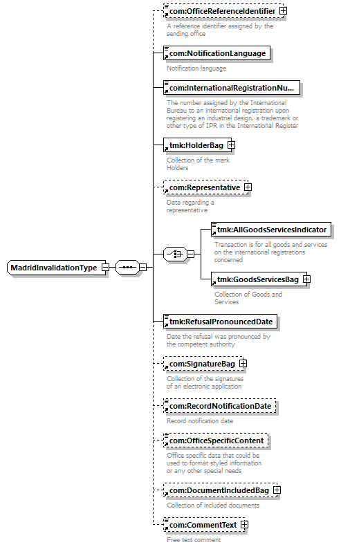 | children | com:OfficeReferenceIdentifier com:NotificationLanguage com:InternationalRegistrationNumber tmk:HolderBag com:Representative tmk:AllGoodsServicesIndicator tmk:GoodsServicesBag tmk:RefusalPronouncedDate com:SignatureBag com:RecordNotificationDate com:OfficeSpecificContent com:DocumentIncludedBag com:CommentText | ||||