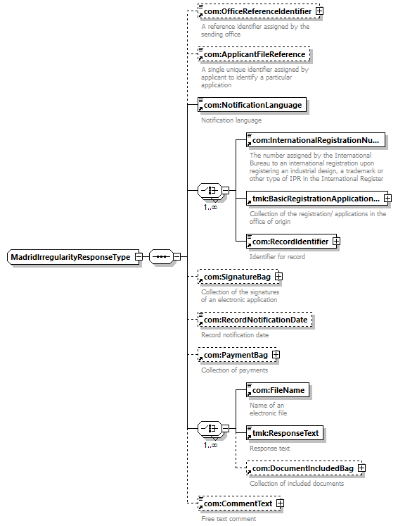 | children | com:OfficeReferenceIdentifier com:ApplicantFileReference com:NotificationLanguage com:InternationalRegistrationNumber tmk:BasicRegistrationApplicationBag com:RecordIdentifier com:SignatureBag com:RecordNotificationDate com:PaymentBag com:FileName tmk:ResponseText com:DocumentIncludedBag com:CommentText | ||||