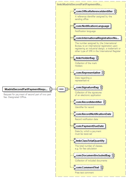 | children | com:OfficeReferenceIdentifier com:NotificationLanguage com:InternationalRegistrationNumber tmk:HolderBag com:Representative com:SignatureBag com:RecordIdentifier com:RecordNotificationDate com:PaymentDueDate tmk:ClassTotalQuantity com:DocumentIncludedBag com:CommentText | ||||