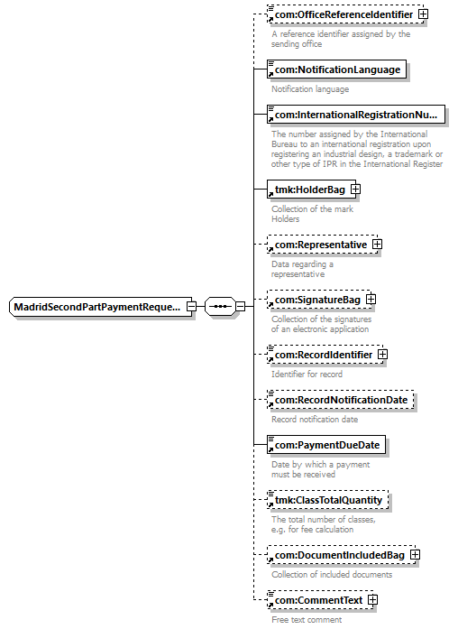 | children | com:OfficeReferenceIdentifier com:NotificationLanguage com:InternationalRegistrationNumber tmk:HolderBag com:Representative com:SignatureBag com:RecordIdentifier com:RecordNotificationDate com:PaymentDueDate tmk:ClassTotalQuantity com:DocumentIncludedBag com:CommentText | ||||