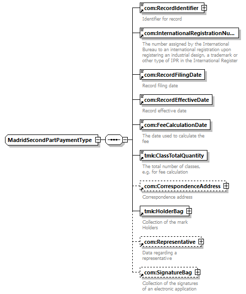 | children | com:RecordIdentifier com:InternationalRegistrationNumber com:RecordFilingDate com:RecordEffectiveDate com:FeeCalculationDate tmk:ClassTotalQuantity com:CorrespondenceAddress tmk:HolderBag com:Representative com:SignatureBag | ||||