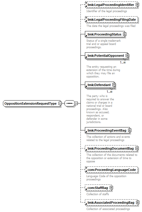 | children | tmk:LegalProceedingIdentifier tmk:LegalProceedingFilingDate tmk:ProceedingStatus tmk:PotentialOpponent tmk:Defendant tmk:ProceedingEventBag tmk:ProceedingDocumentBag com:ProceedingLanguageCode com:StaffBag tmk:AssociatedProceedingBag | ||||