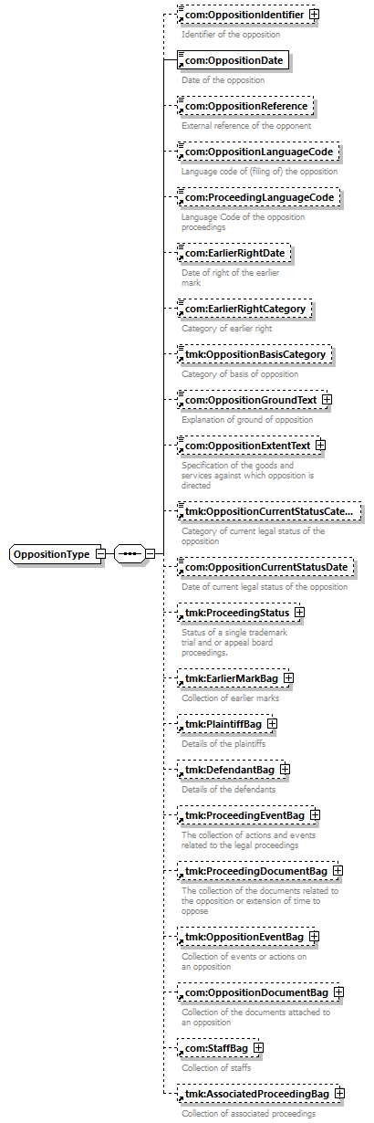 | children | com:OppositionIdentifier com:OppositionDate com:OppositionReference com:OppositionLanguageCode com:ProceedingLanguageCode com:EarlierRightDate com:EarlierRightCategory tmk:OppositionBasisCategory com:OppositionGroundText com:OppositionExtentText tmk:OppositionCurrentStatusCategory com:OppositionCurrentStatusDate tmk:ProceedingStatus tmk:EarlierMarkBag tmk:PlaintiffBag tmk:DefendantBag tmk:ProceedingEventBag tmk:ProceedingDocumentBag tmk:OppositionEventBag com:OppositionDocumentBag com:StaffBag tmk:AssociatedProceedingBag | ||||