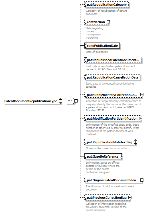 | children | pat:RepublicationCategory com:Version com:PublicationDate pat:RepublishedPatentDocumentKindCode pat:RepublicationCancellationDate pat:SupplementaryCorrectionCodeBag pat:ModificationPartIdentification pat:RepublicationNoteTextBag pat:GazetteReference pat:OriginalPatentDocumentIdentification pat:PreviousCorrectionBag | ||||